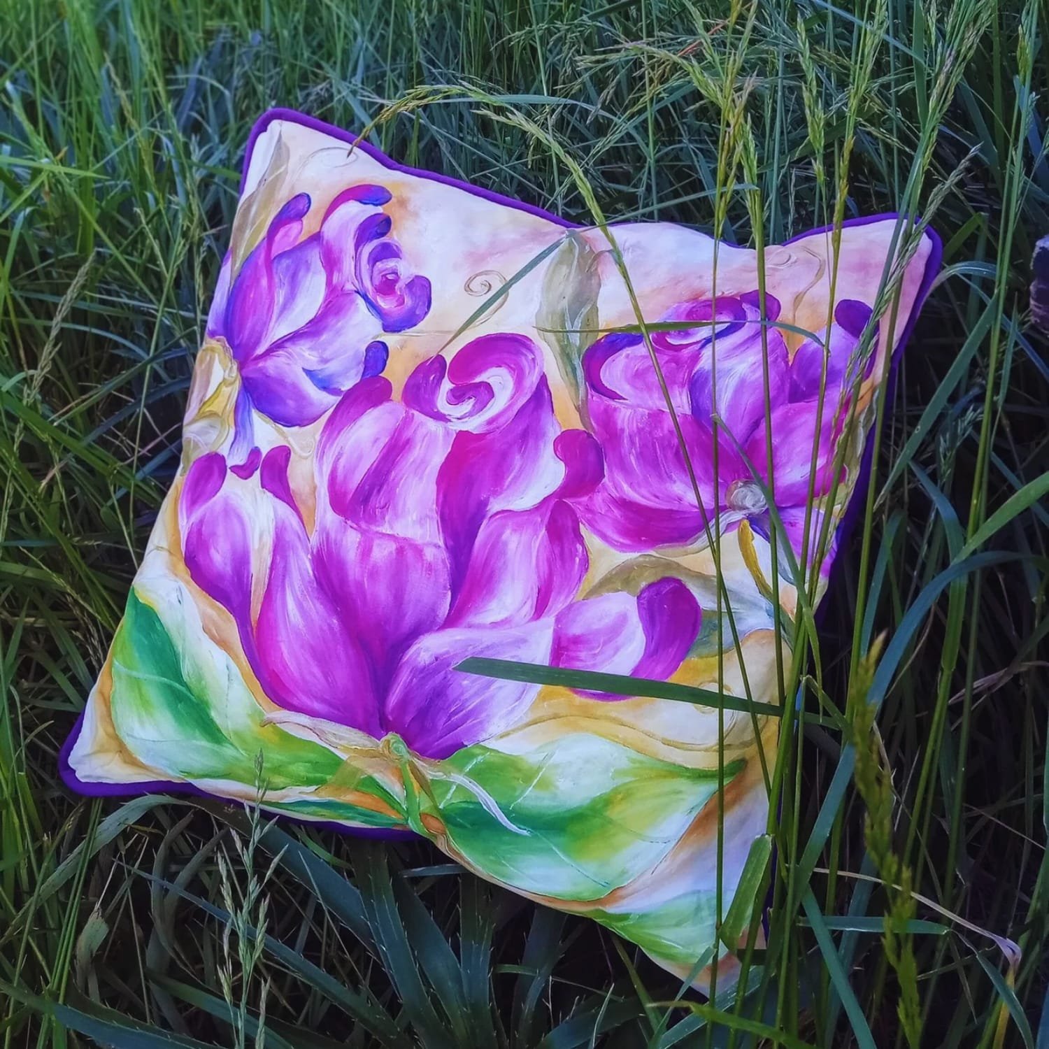 Cada almohadón es una pieza única creada en la energía de la LINEA PURPURA, pensada para armonizar espacios, acompañar procesos creativos y traer calidez al hogar.